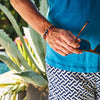 This is Fontelina, named after the Fontelina beach club in Capri, Italy. It is made of blue Lapis Lazuli beads from Afghanistan, a colorful assortment of African Christmas beads and a 100% sterling silver Billy Baker Co. logo piece.
