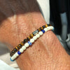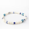 This is Santorini, named after the Greek island known for it's white-washed buildings with blue roofs. It is made from ivory bone beads, blue Lapis Lazuli beads, assorted light blue chevron beads and a 100% sterling silver Billy Baker Co. logo piece.