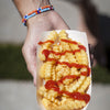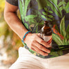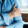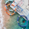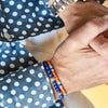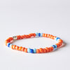 This is Truth, named after the New Mexico town Truth and Consequences. It is hand-beaded from small orange, turquoise and cobalt blue glass beads from Africa in a color-block pattern and a 100% sterling silver Billy Baker Co. logo piece. Pair with Consequences for a great stack look.