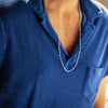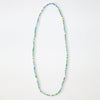This is Aqua, named the varied colors of the sea. It is made from a strand of blue, white and green tiny glass seed beads from Afghanistan and a 100% sterling silver Billy Baker Co. logo piece.